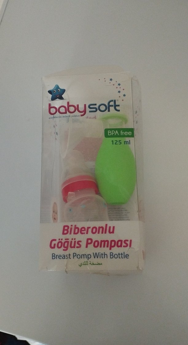 Baby Soft göğüs pompası, 125 ml kırmızı biberonla birlikte gelir, BPA içermez ve güvenli kullanım sağlar. Nazik ve etkili süt sağımı sunar.