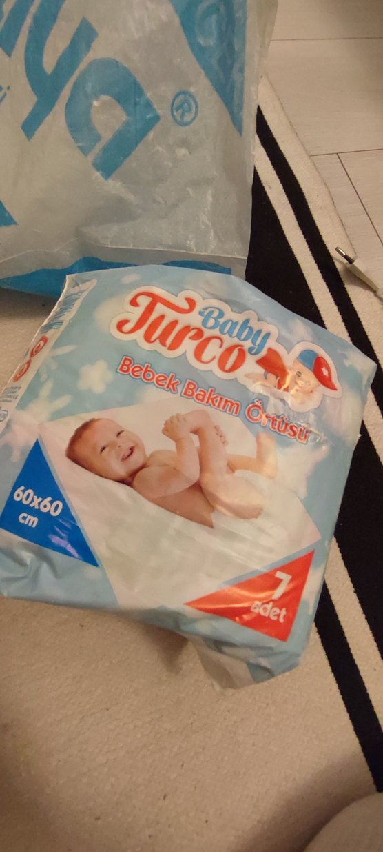 Baby Turco bebek bakım örtüsü 60x60 cm ölçüsünde ve 7 adet olarak paketlenmiştir. Bebek hijyeninde kullanılabilir. 2 adet alt değiştirme bezi 2 paket göğüs pedi 1 adet süt pompası. pompa kullanıldı diğerleri sıfır