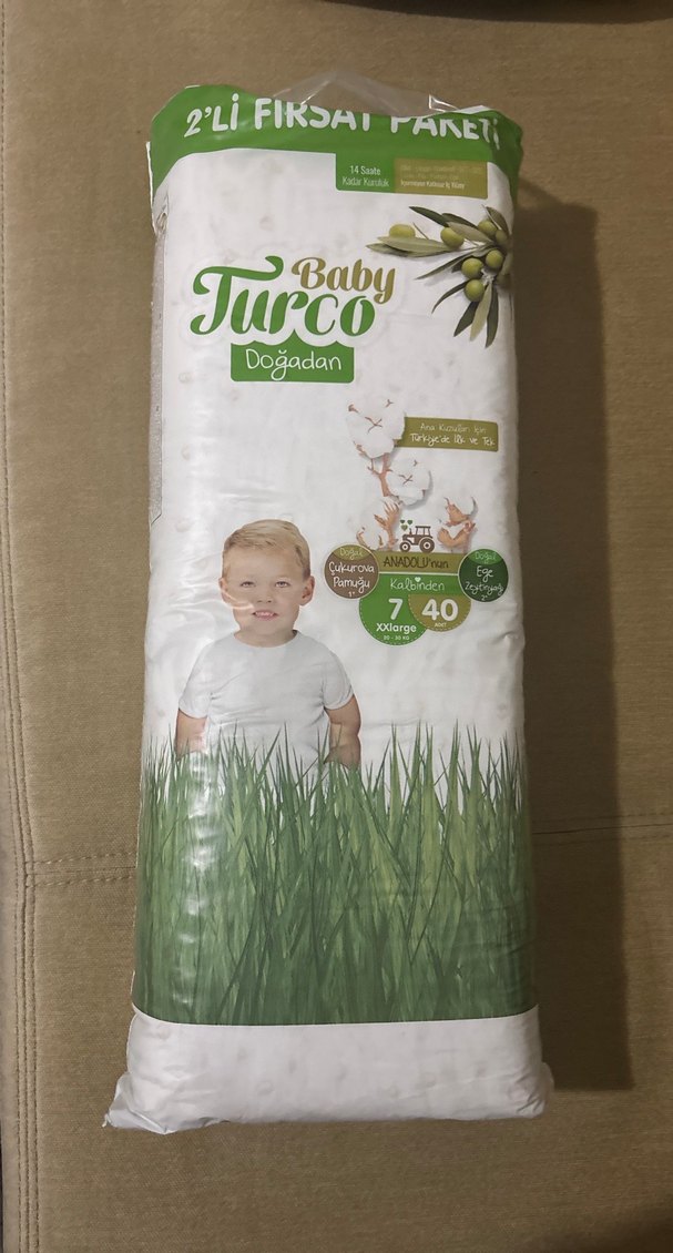 Baby Turco Doğadan 7 numara bebek bezi, doğal pamuk ve çevre dostu malzemeler içerir. Pakette 40 adet bez bulunur.