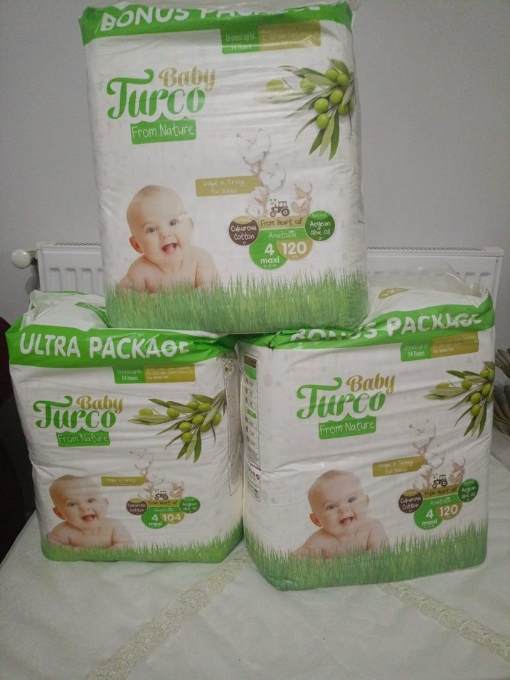 Baby Turco bebek bezleri doğal içerikli, yumuşak ve nazik, 4 numara, paketinde 120 adet bulunur.