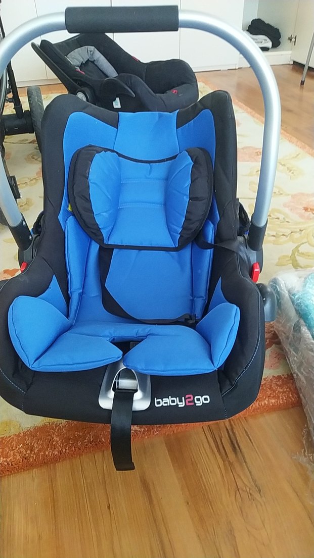 Koyu mavi Baby2go bebek oto koltuğu, yanları yastıklı ve ayarlanabilir kayışlıdır. Bebekler için güvenli ve konforludur.