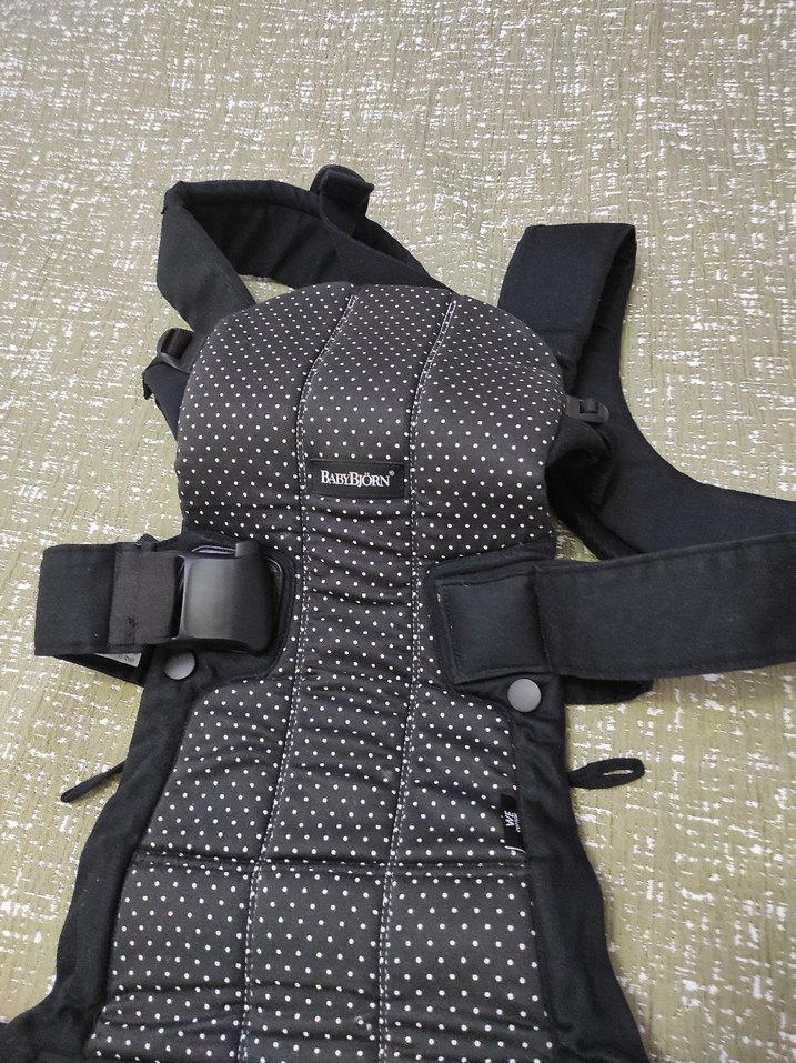 Ayarlanabilir askılı, benekli desenli siyah BabyBjörn bebek taşıyıcı.