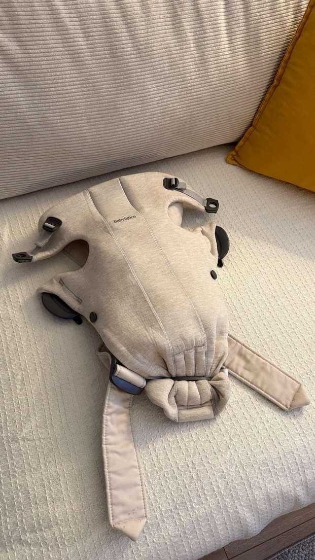 Yumuşak kumaş ve ayarlanabilir kayışlara sahip bej bebek taşıyıcı, bebeğinizi güvenli ve rahat taşımanızı sağlar.