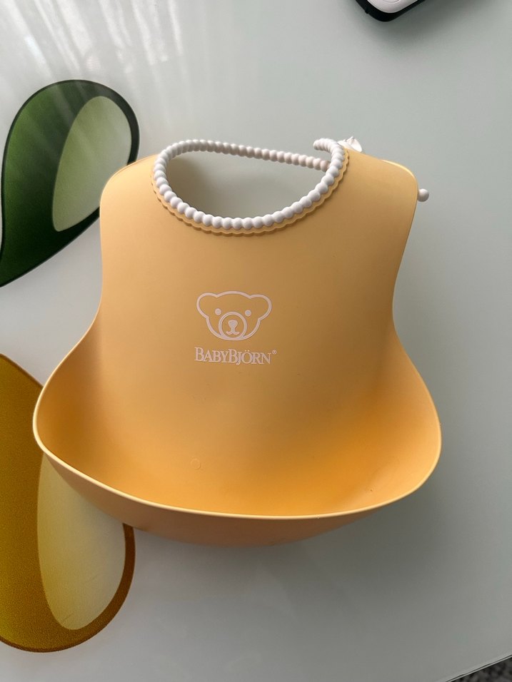 Pastel sarı renkte BabyBjörn bebek önlüğü, baskılı ayı logosu ve kırıntıları yakalayan derin cep içerir. Ayarlanabilir boyun askısı bulunur.