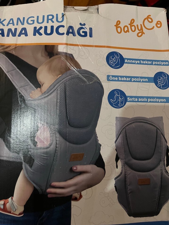 BabyCo gri bebek kanguru, anneye bakar, öne bakar ve sırta asılı olmak üzere üç taşıma pozisyonu sunar. Bebek ve ebeveyn için konfor sağlar.
