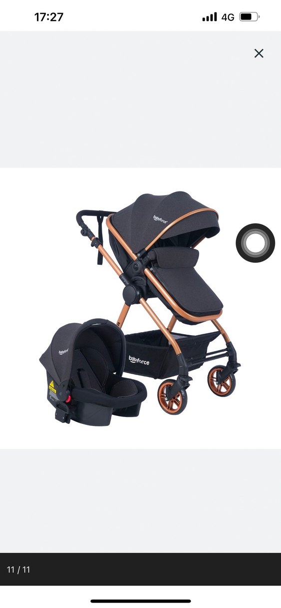 Babyforce bebek arabası koyu siyah renkte, sağlam çerçeve ve ayarlanabilir tente içerir. Konforlu oturma yeri ve saklama sepeti bulunur.