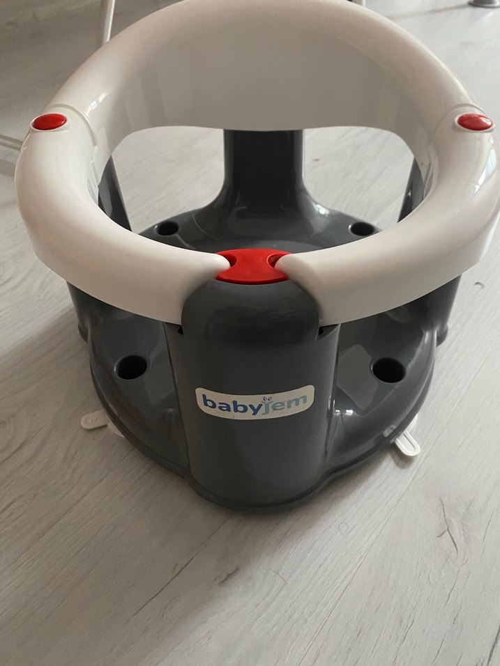 BabyJ marka gri bebek mama sandalyesi oturağı, beyaz ve kırmızı güvenlik tutamaklarıyla konforlu oturma sağlar.