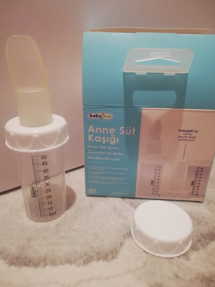 Babyjem anne sütü kaşığı, 50ml kapasiteye sahip, yumuşak pastel renkli silikon kaşık ve kapak içerir. Hijyenik ve kolay kullanım sağlar.