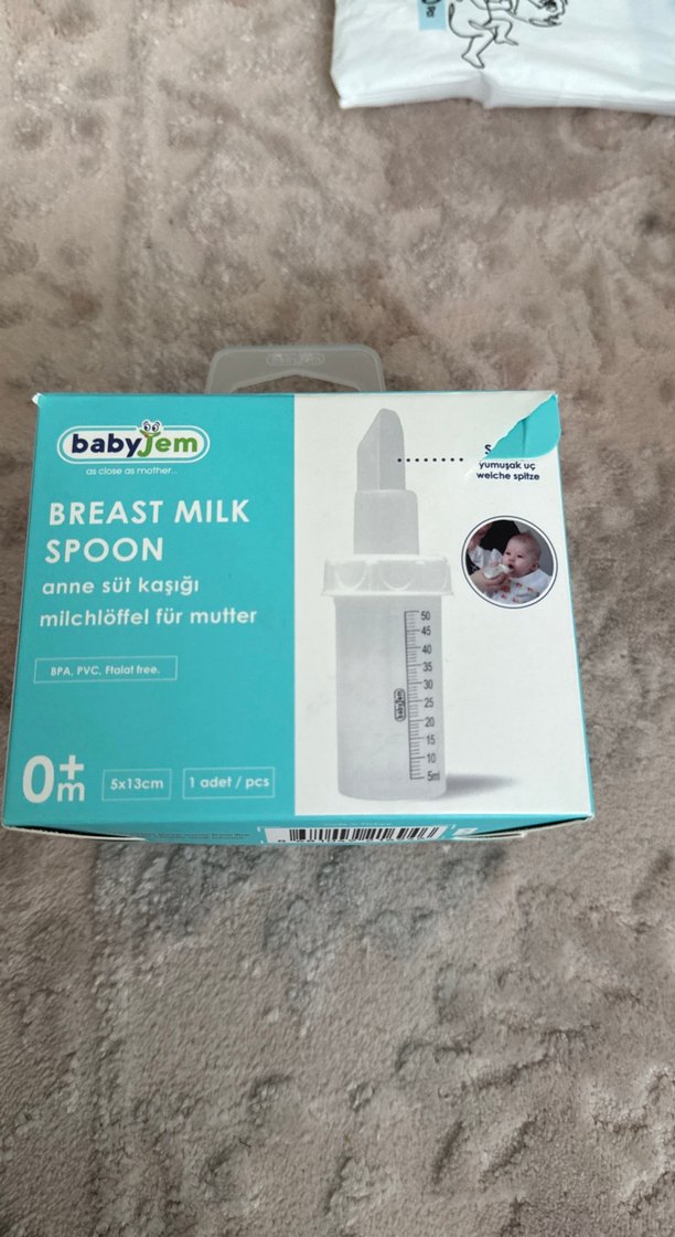 Babyjem anne süt kaşığı, yumuşak uçlu, 5x13 cm ölçülerinde, BPA ve PVC içermez, güvenli besleme için tasarlanmıştır. Sadece bi kaç defa kullanıldı.