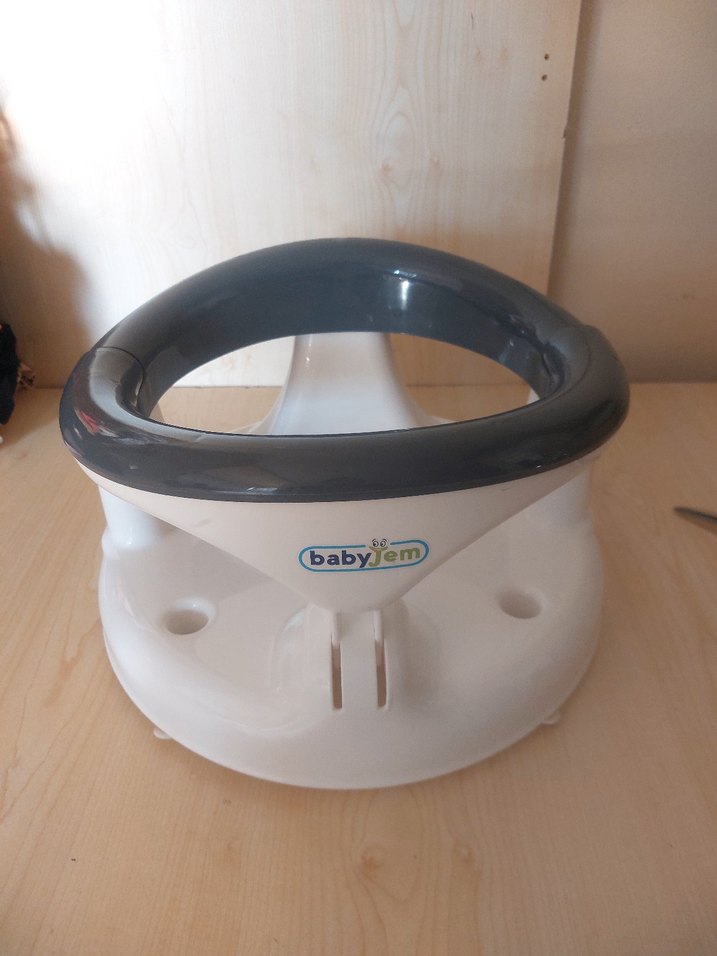 Babyjem markalı gri-beyaz renkli bebek oturağı, banyo veya mama sandalyesi olarak rahat kullanım sağlam vakumlu taban... kullanılmış üründür..