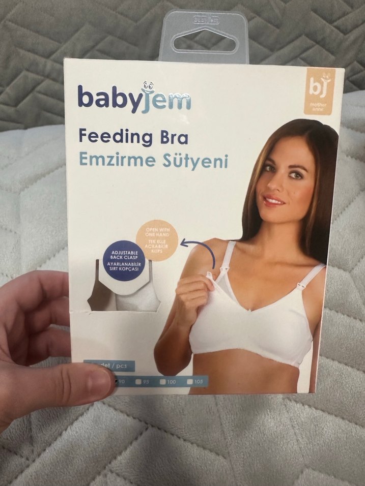 Babyjem beyaz emzirme sütyeni, baskılı desene ve normal midi boyda, rahat ve kolay emzirme için tasarlanmıştır. 85 bedendir