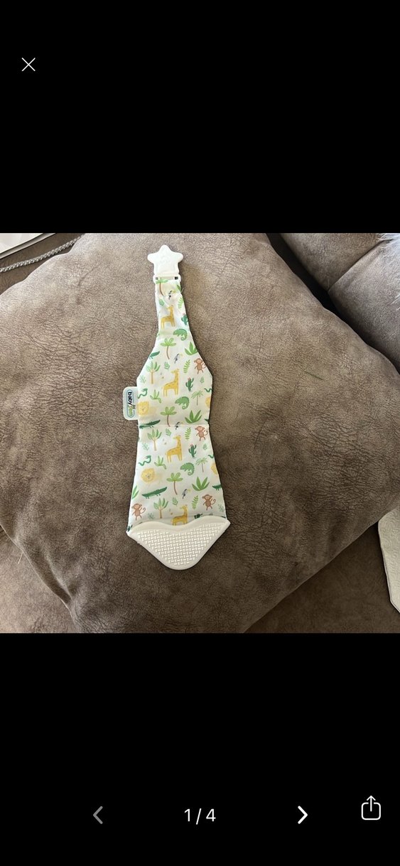 Baby Jem marka, diş kaşıyıcı kravat. Kıyafete takma kısmı vardır. Hışırtılı dokudadır bebeği sesiyle oyalar. Uç kısmında slikon tırtıklı diş kaşıyıcısı var. Uç kısım: BPA ve ftalat içermez. Gıdaya uygun silikondan üretilmiştir. Gövde: Polyester.