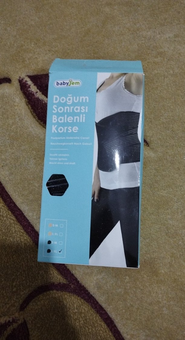 BabyJem markalı, balenli, baskılı ve siyah renkte doğum sonrası korse. Normal uzunlukta ve vücuda oturan tasarıma sahiptir. sezaryen olduğum için kullanmadım ben.