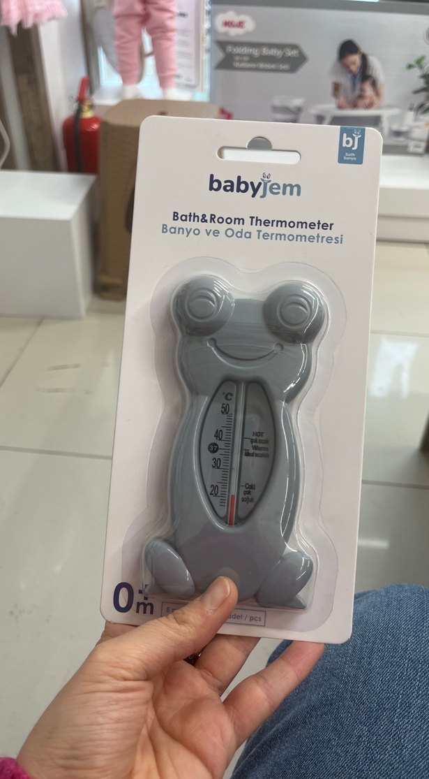 babyjem gri renkli, banyo ve oda sıcaklığını ölçen kurbağa şeklinde termometre. Doğumdan itibaren kullanılabilir.