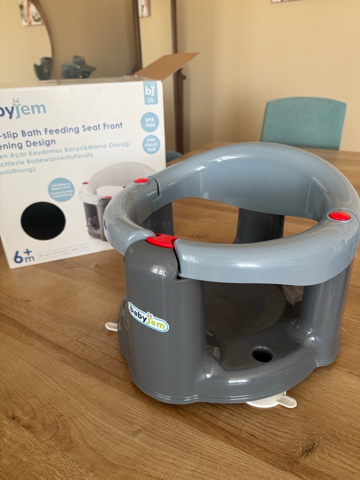 Güvenli vakumlu ayaklarıyla sabitlenen, 6 aydan itibaren kullanılabilen gri bebek beslenme&banyo oturağı.Hiç kullanılmadı, kutulu.