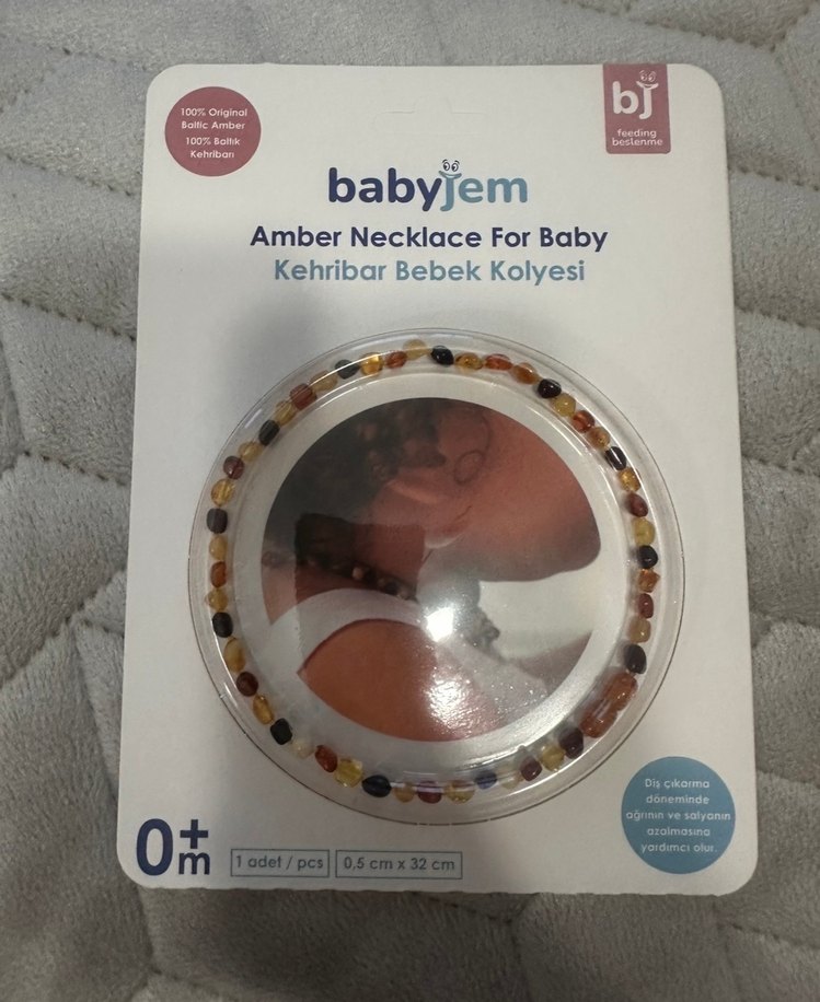0+ ay bebekler için Babyjem kehribar kolye, 0.5 cm x 32 cm ölçülerinde, %100 orijinal Baltık kehribar boncuklardan yapılmıştır.