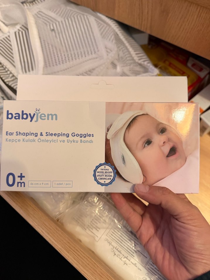 babyjem Kepçe Kulak Önleyici ve Uyku Bandı, doğumdan itibaren bebeklerin kulaklarını nazikçe destekler. Yumuşak ve nefes alabilen kumaş kullanılmıştır.