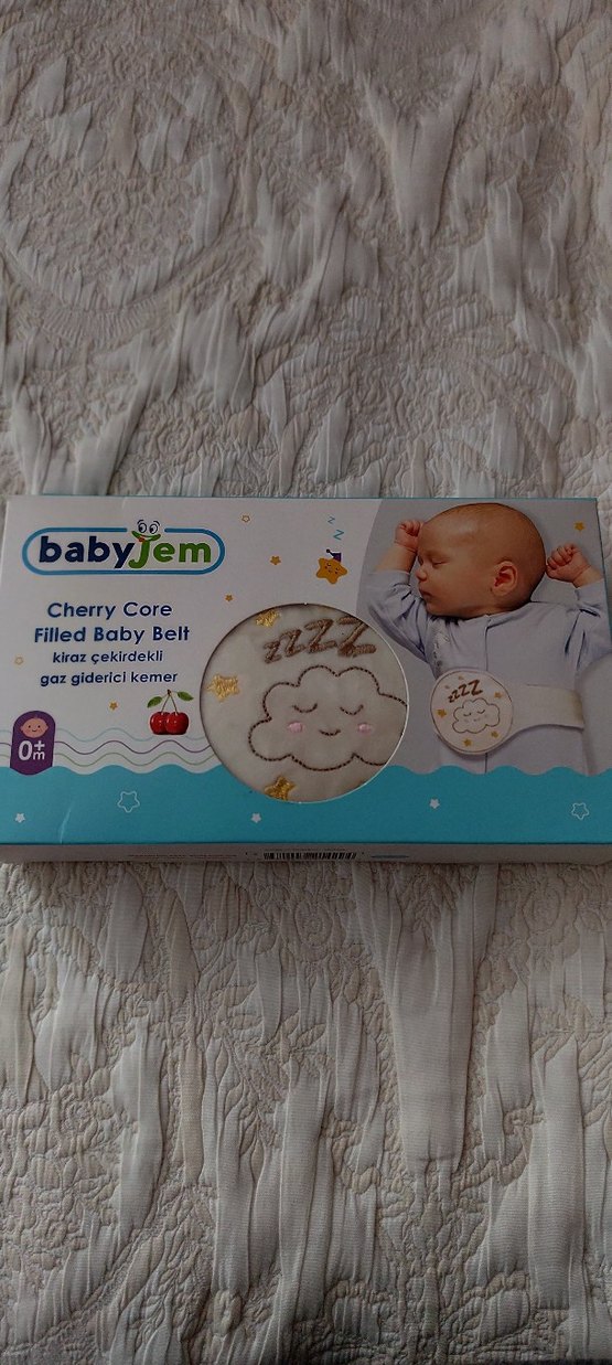 BabyJem kiraz çekirdekli, gaz giderici bebek kemeri. Beyaz, işlemeli ve yumuşak kumaştan üretilmiştir. 0+ ay bebekler için uygundur. Hiç kullanılmamıştir. #bebek#gazgiderici#bebek kemeri#