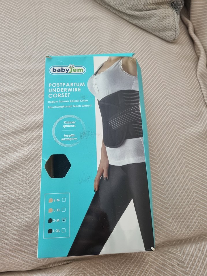 Babyjem elastik, straplez korse, siyah renkte, baskılı sentetik kumaştan üretilmiştir. Doğum sonrası destek için ince gösteren telleri bulunur.