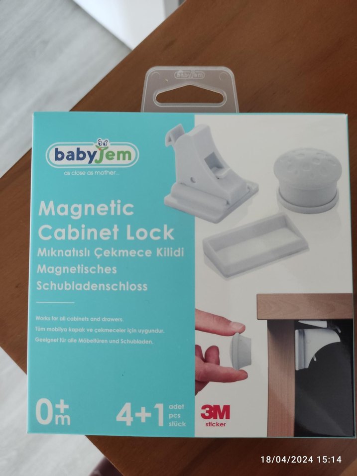 BabyJem manyetik çekmece kilidi seti, 4 kilit ve 1 anahtardan oluşur. 3M sticker ile kolay montaj sağlar, dolap ve çekmeceleri güvenli kılar.