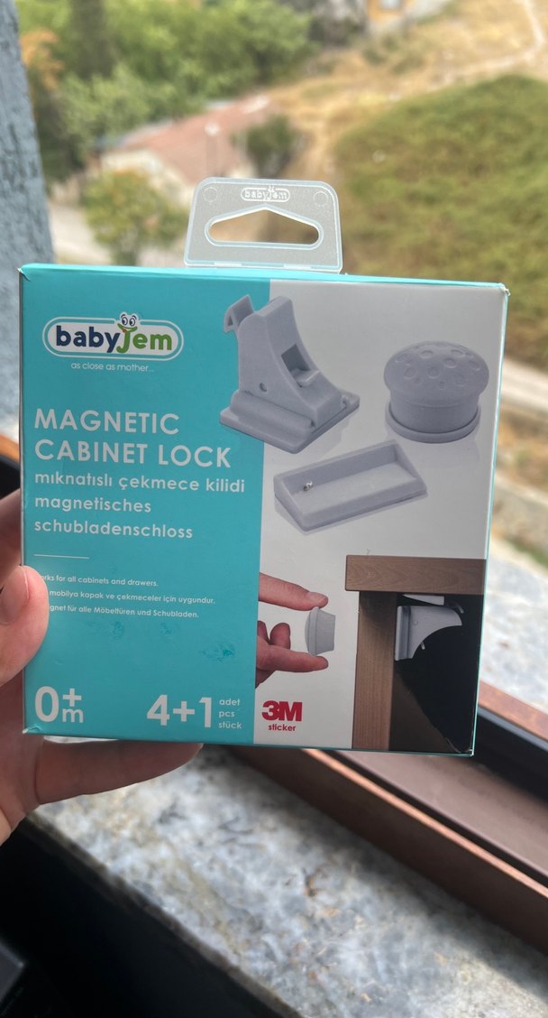 BabyJem manyetik çekmece kilidi seti, 4 kilit ve 1 anahtardan oluşur. Gri renkte olup, dolap ve çekmeceleri güvenli şekilde kapatır.
