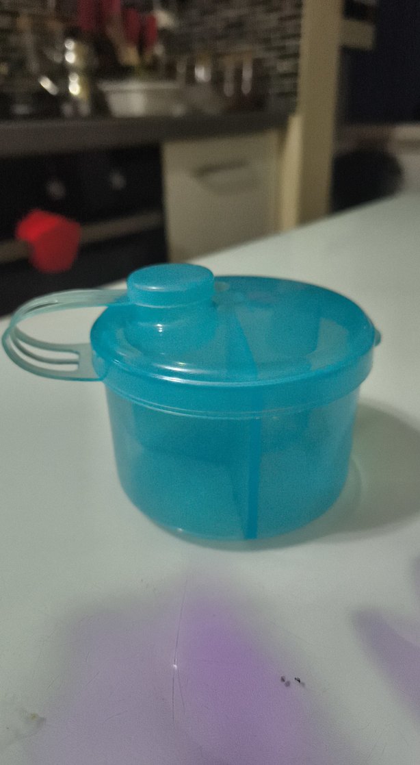 babyJem Mavi renkte, bölmeli kapağı olan bebek toz mama saklamak için kap.