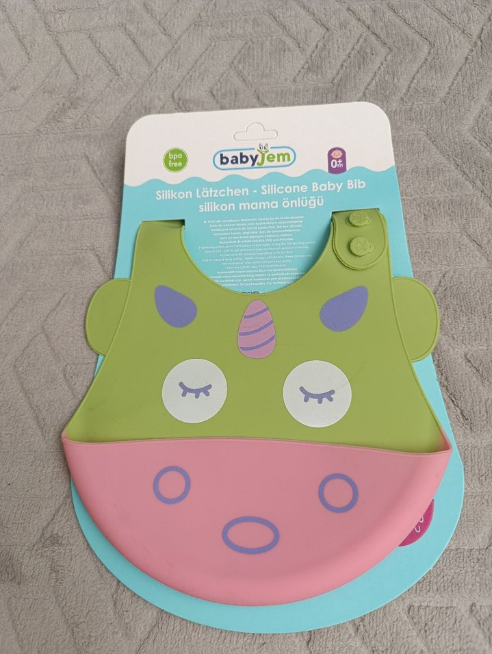 babyJem silikon bebek mama önlüğü, pastel çok renkli baskılı tasarıma ve yiyecek yakalayıcı cep özelliğine sahiptir. BPA içermez ve ayarlanabilir.
