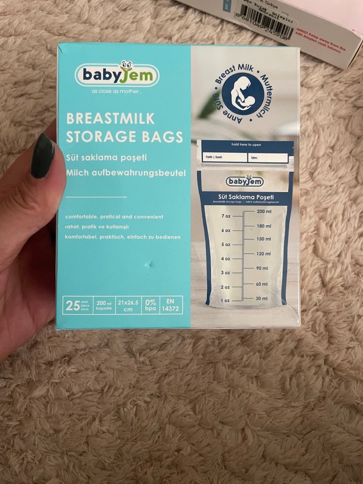 BabyJem süt saklama poşetleri, pastel bej renkte, paket 25 adet fakat içerisinden 5 adet kullandım.her biri 200 ml kapasitede. Ölçü işaretli, güvenli ve pratik süt saklama sağlar.
