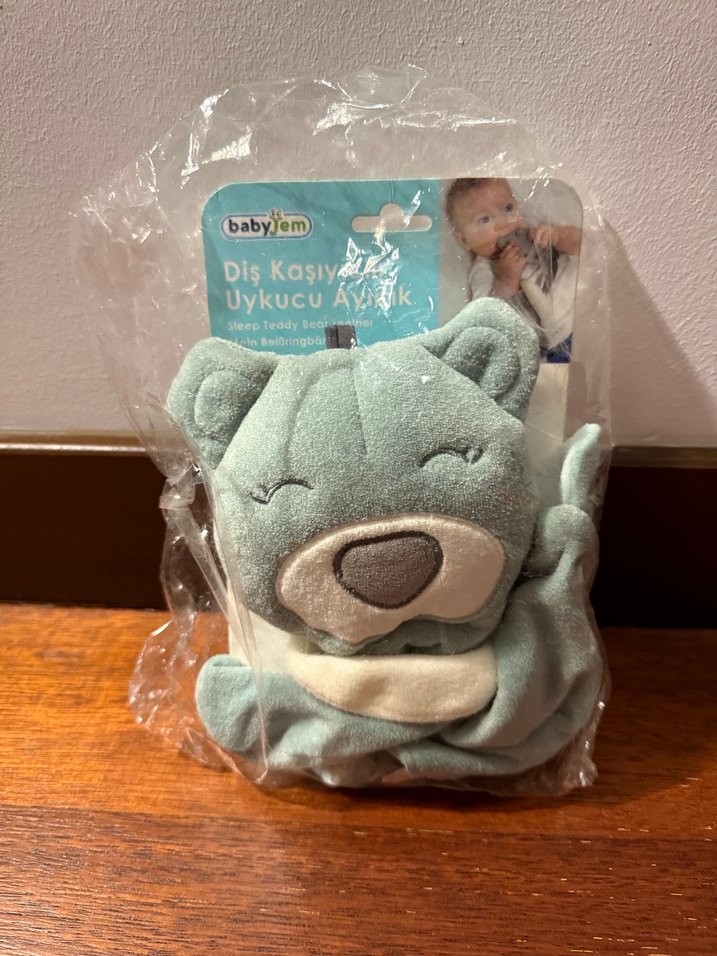 Babyjem markasına ait turkuaz ve gri renklerde, yumuşak kumaştan yapılmış diş kaşıyıcı ve uyku ayıcığıdır. Bebekler için rahatlatıcıdır.