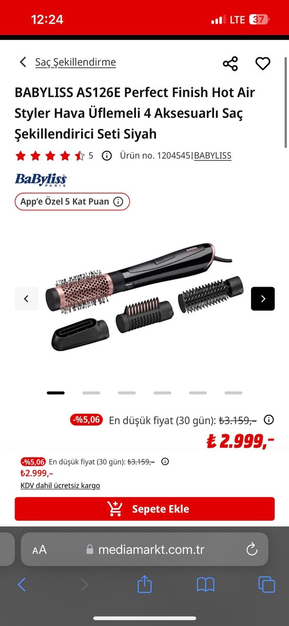 BaByliss siyah saç şekillendirici seti, dört aksesuarla birlikte gelir. Saçı kurutmak ve şekillendirmek için farklı fırça başlıkları içerir. 3,4ay kullandım garantisi vardı hala var temiz 3200e almıştım