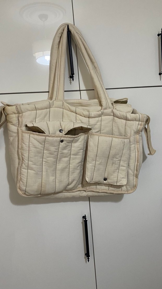 Fermuarlı kapanışa sahip beyaz keten kadın el çantası, önünde kullanışlı çoklu cepler bulunur. Günlük sokak giyimine uygundur. Çantanın ön kısmında lekelenmeler vardır yıkadım çıkmadı sadece 1 kez kullanıldı