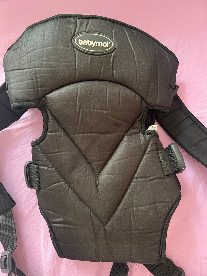 Babymol marka siyah bebek taşıyıcı, dolgulu ve ayarlanabilir askılarla rahat kullanım sağlar.