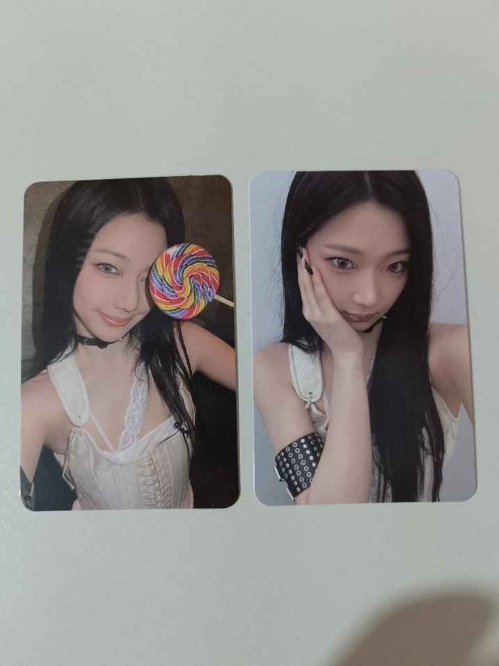 İki foto kartı içeren beyaz hafıza kartı, birinde kadın renkli lolipop tutuyor.