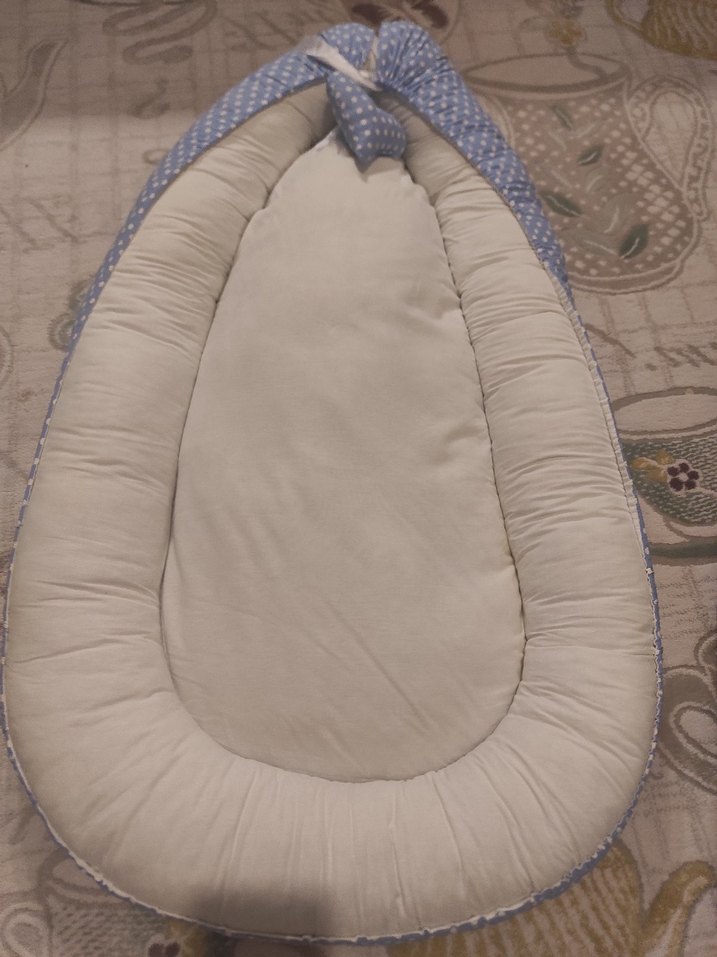 Yumuşak sentetik kumaştan yapılmış mavi beyaz bebek uyku minderi, rahat bir uyku alanı sunar. Çift taraflı kullanıma uygun.