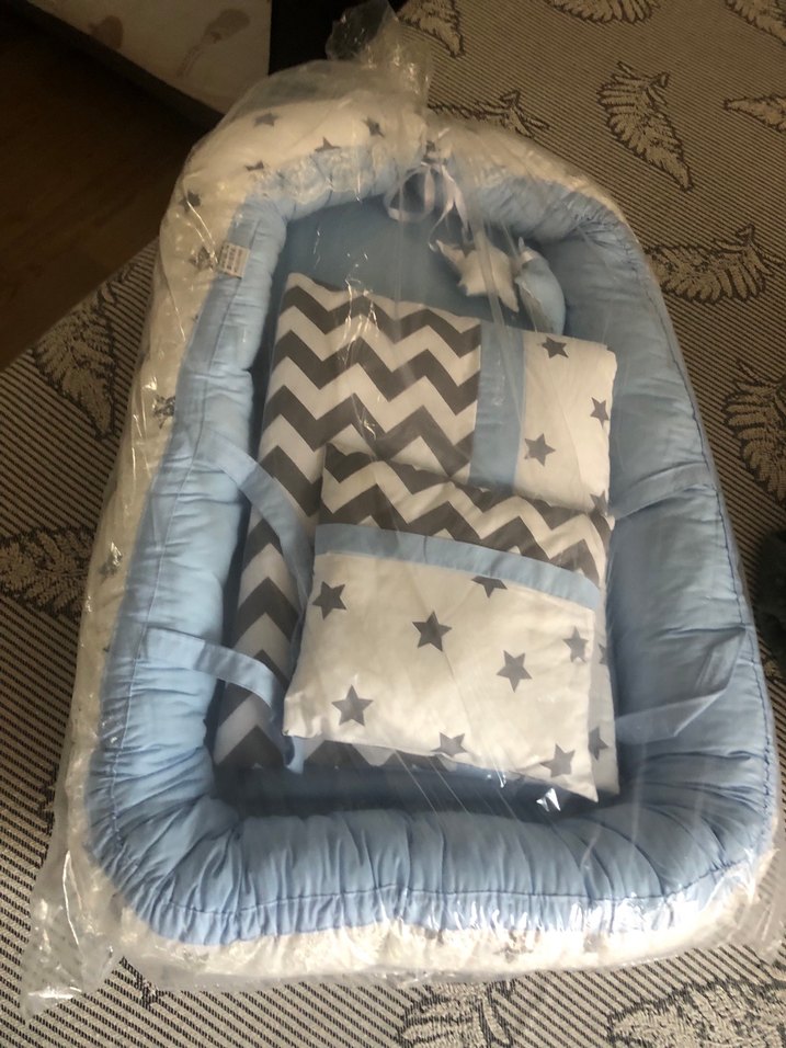 Mavi ve gri renklerde yıldız ve zikzak desenli, yumuşak pamuklu kumaştan yapılmış bebek uyku seti. Toplam 3 parça. İçinde yastık ve dolgulu uyku yuvası bulunur. Hiç kullanılmadı ihtiyaç fazlası ambalajıyla birlikte duruyor.
