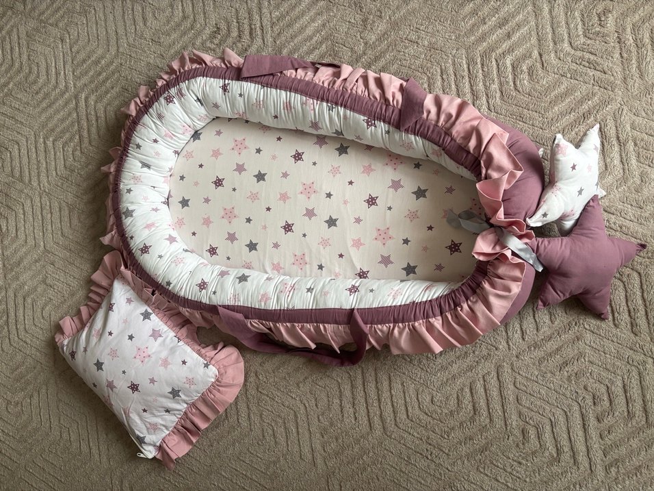 Pastel pembe ve mor tonlarda, nakışlı yıldız desenli yumuşak sentetik kumaştan bebek uyku yatağıdır.