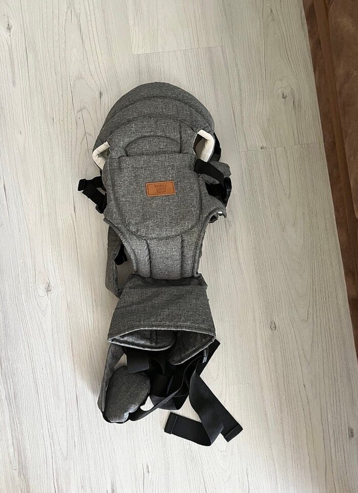 Baby Plus Ayarlanabilir askılı, yumuşak gri bebek taşıyıcı kanguru. Rahat ve güvenli bebek taşıma sağlar.