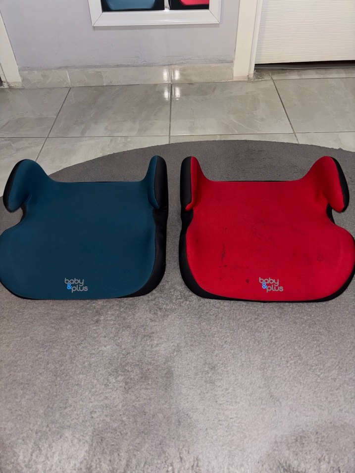 BabyPlus çocuklar için koyu mavi ve kırmızı renklerde araba koltuğu yükselticileri. Araba güvenliği için yükseltilmiş oturma pozisyonu sağlar.