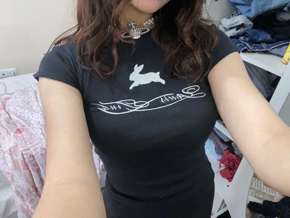Yüksek yakalı, kısa kollu, pamuklu siyah tişörtü, parlak baskılı tavşan ve yazı detayıyla günlük kullanıma uygun.