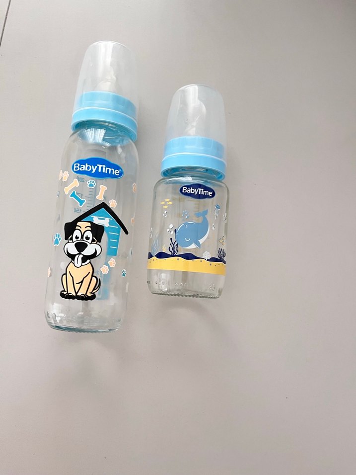BabyTime bebek biberonları, mavi renkli kapaklar ve köpek ile balina desenleriyle gelir. Koruyucu şeffaf kapaklara sahiptir.