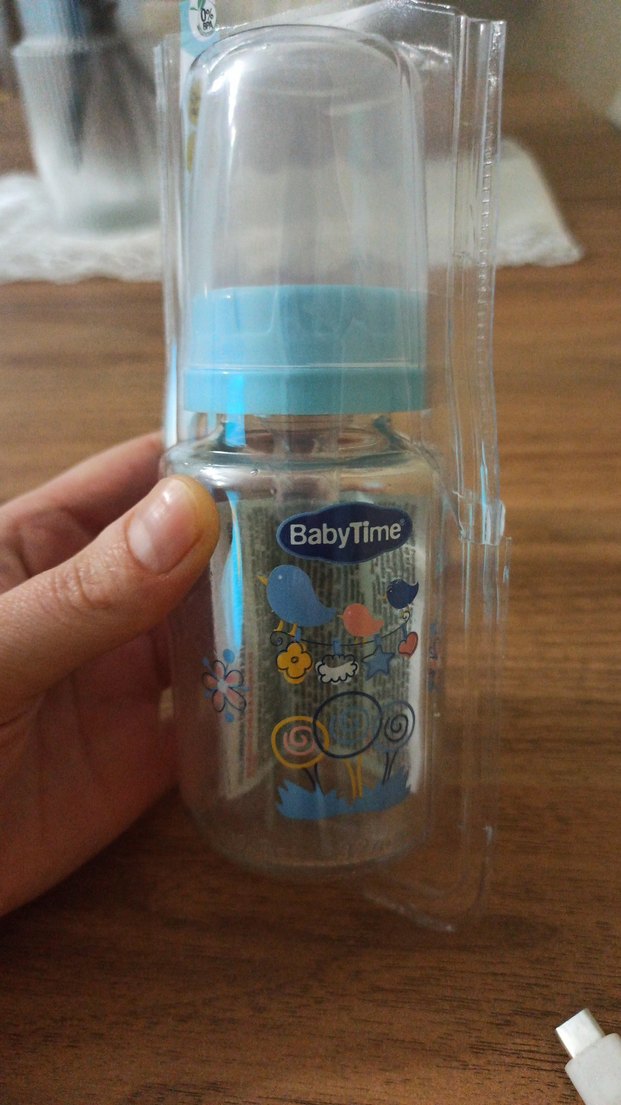 BabyTime marka mavi kapaklı, renkli desenli bebek biberonu, bebek beslemeye uygundur. bakmak için baş kısmını kesmiştim hiç kullanilmadi