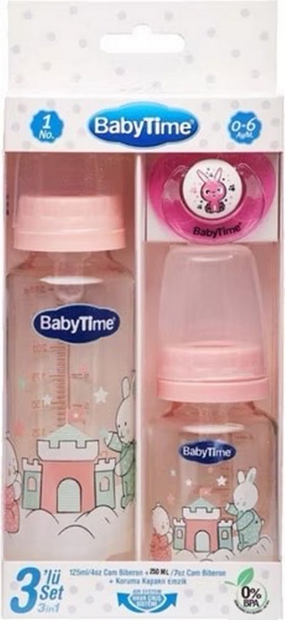 BabyTime pembe renkli 0-6 ay bebekler için biberon ve emzik seti. Pastel tonlarda, yumuşak tasarımlı.