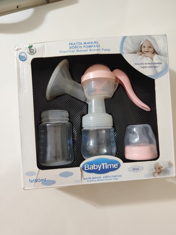 BabyTime göğüs pompası seti, pastel pembe manuel pompa ve süt toplama şişeleri içerir. Kolay süt sağımı ve saklama sağlar.Bir kaç kere kullanılmıştır.