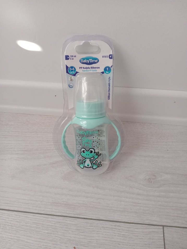 BabyTimo bebek biberonu pastel turkuaz renkte, 150 ml kapasiteye sahip ve kolay tutuş için ergonomik saplıdır.