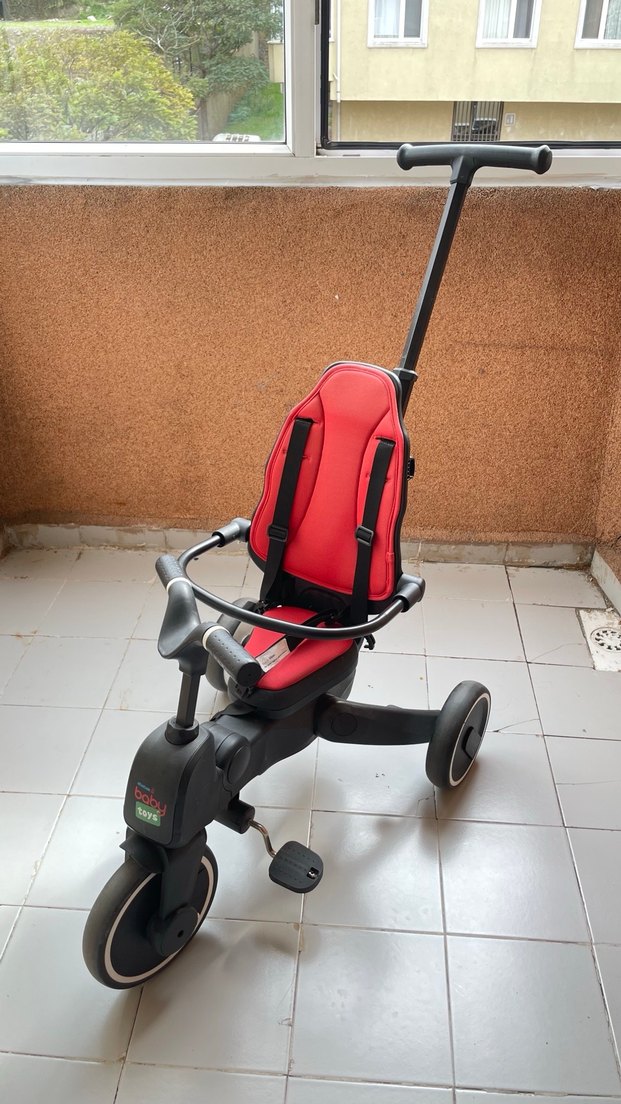 Koyu kırmızı renkte, emniyet kemerli konforlu oturma yeri ve kolay kontrol için itme saplı üç tekerlekli çocuk bisikleti. Sağlam tekerlekleri ve pedalları vardır. 3 4 kere dışarı çıkmışızdır, kızım yürümeyi sevdiği için biraz boşuna aldığım bir şey oldu. Çalışmayan aksamı yok, katlanabildiğini iddia ediyor e bebek hiç denemedim