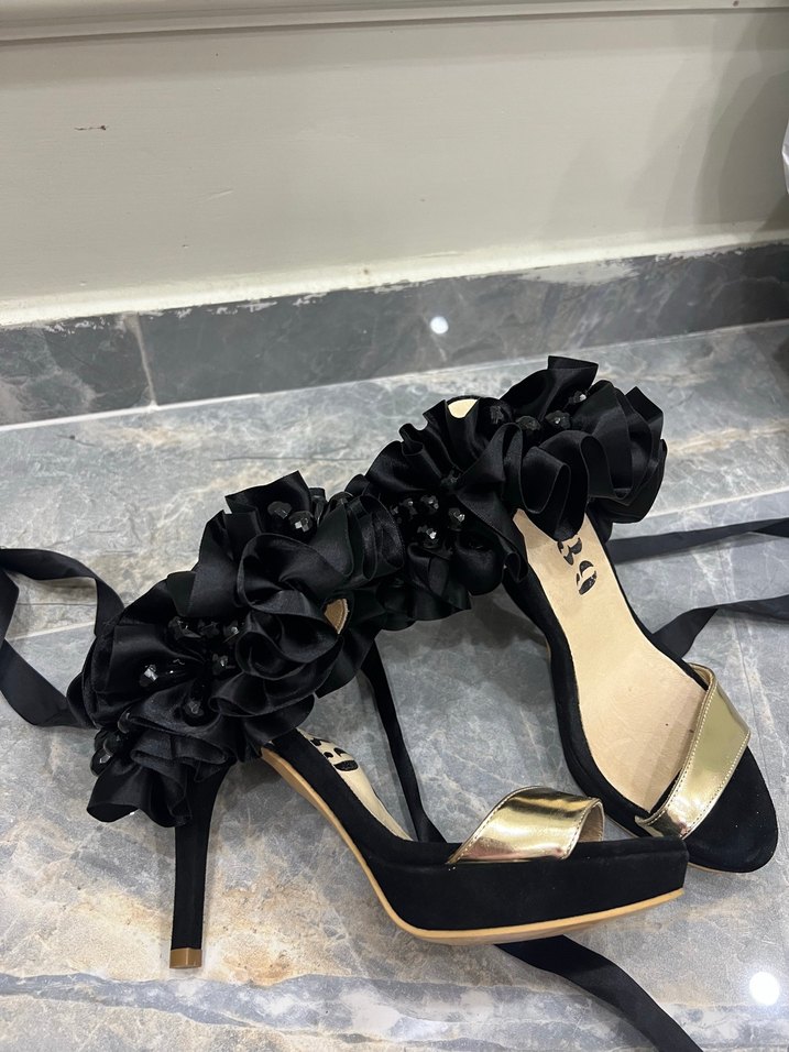 Saten siyah, parlak çiçek desenli, fırfırlı yüksek topuklu abiye ayakkabılar, düğün ve şık görünümler için uygundur.