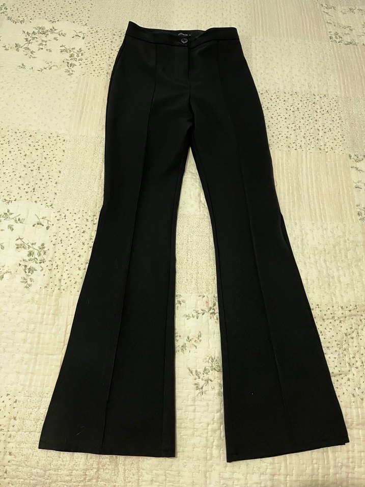 Dantel detaylı, midi boy, normal kesim siyah kumaş pantolon. Ofis için uygun, trendy gotik tarzda.