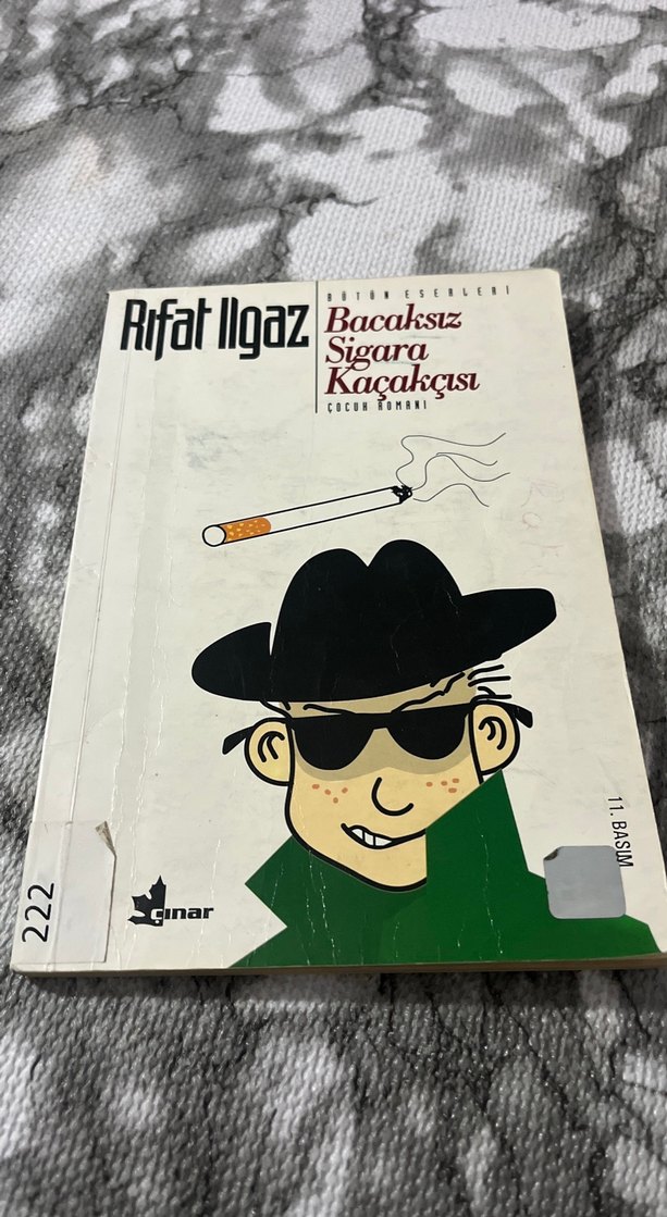 Rıfat Ilgaz'ın "Bacaksız Sigara Kaçakçısı" adlı romanının kapağında güneş gözlüğü ve şapka takan bir karakter ile sigara görseli yer alıyor.