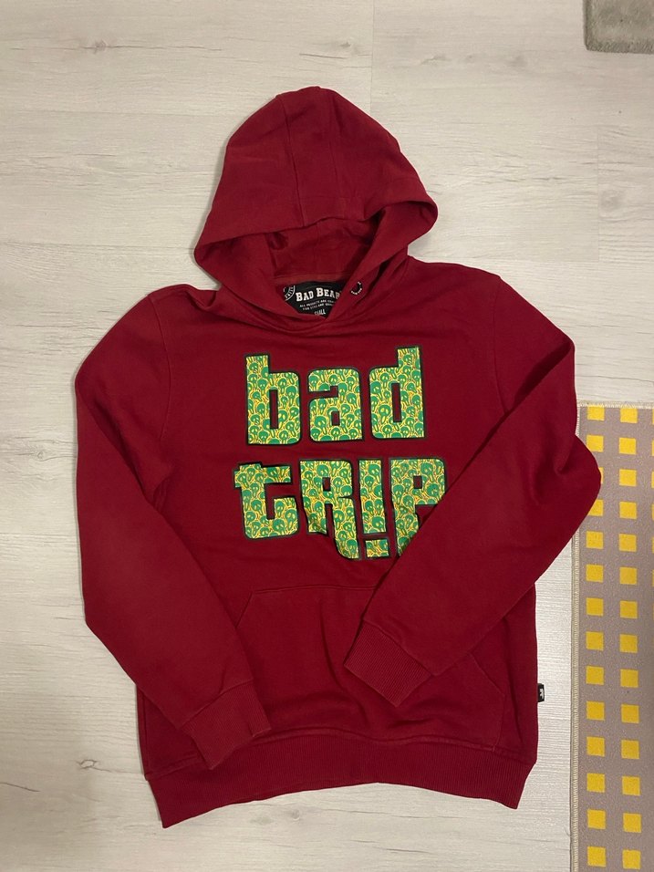 Bordo renkli, kapüşonlu ve uzun kollu erkek sweatshirt. Önünde renkli 'bad grip' baskısı ve düğme detayları bulunur. Yumuşak, sıcak kumaştan üretilmiştir.
