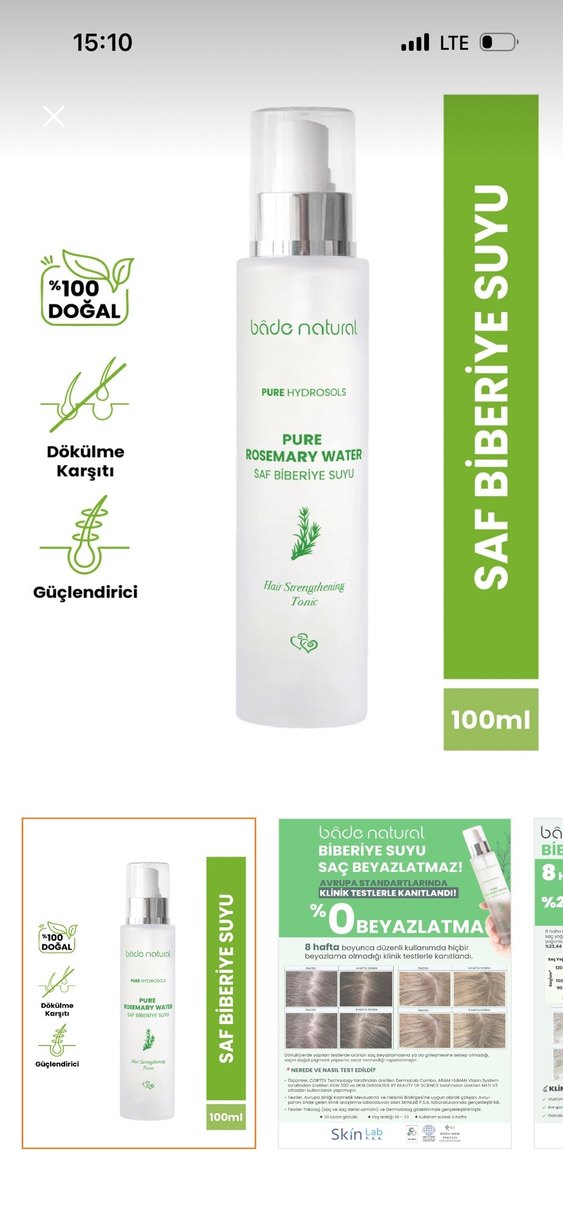 Bade Natural saf biberiye suyu içeren tonik, saçları güçlendirir ve dökülmeye karşı korur. %100 doğal ve saç beyazlatmaz.